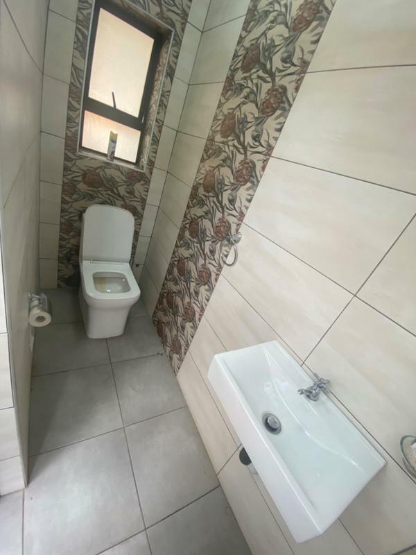 The entertainment area is modern and inviting, with a heated pool, lapa with built in braai and bar and lovely boma area for the cold winter days. A guest toilet is conveniently situated next to it.