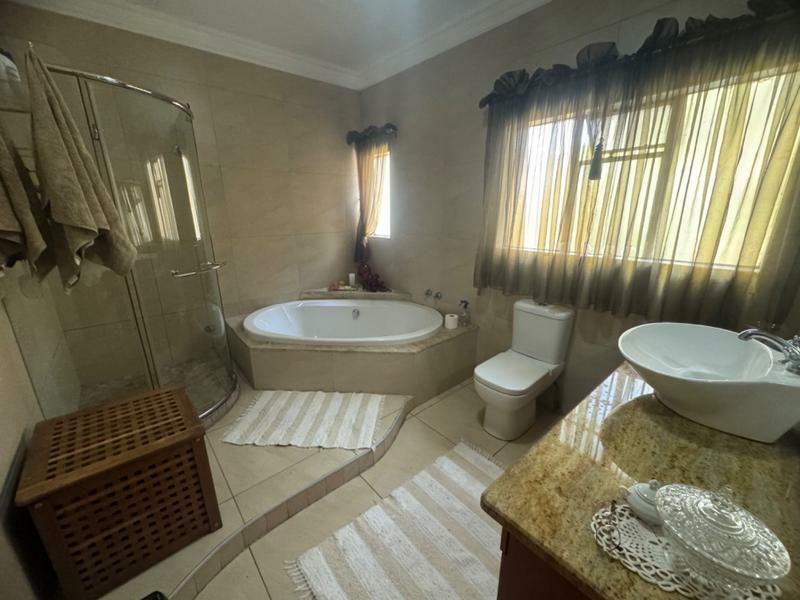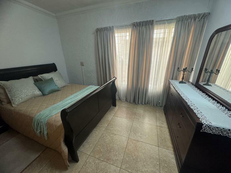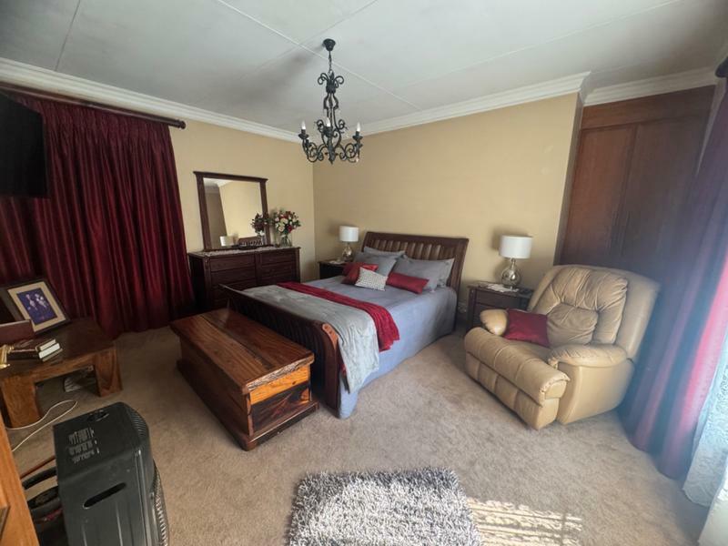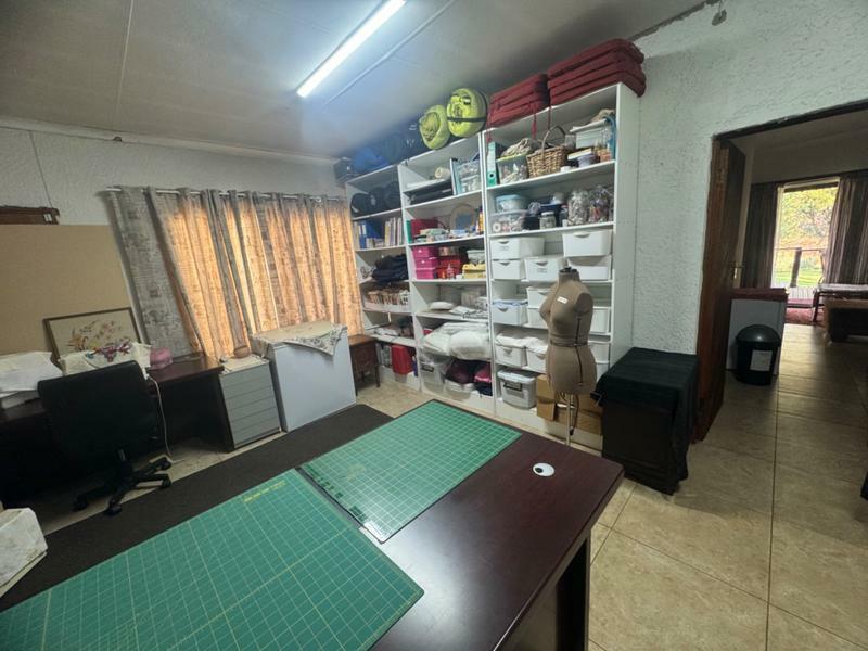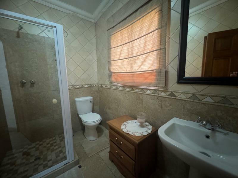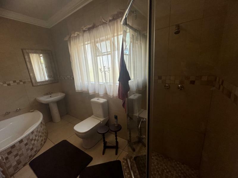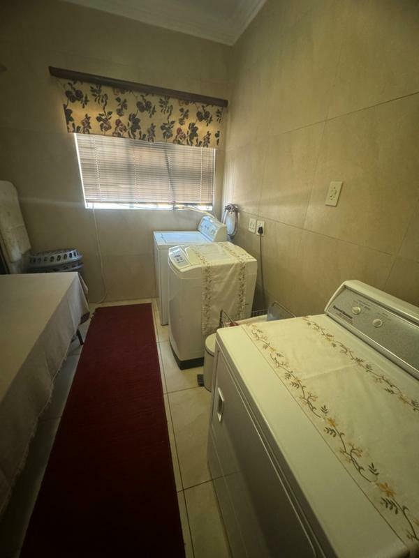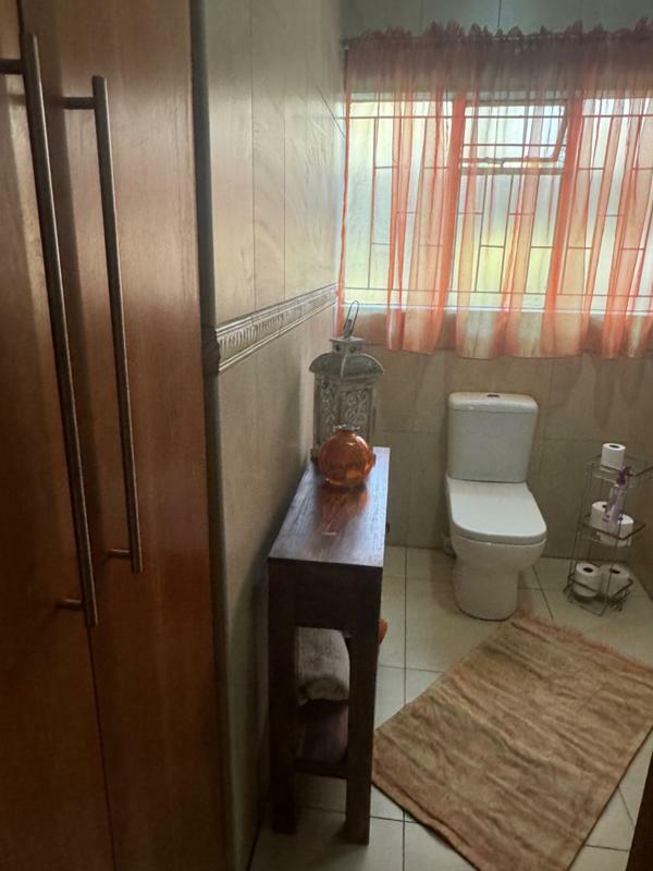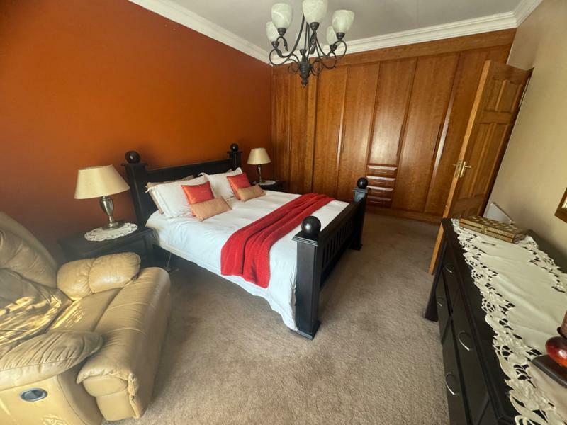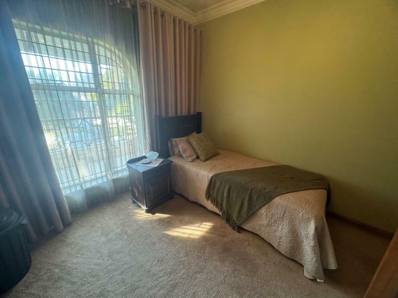 The main dwelling offers a guest toilet at the main entrance, next to the lounge and living room. Adjacent is a dining room and large kitchen with lots of cupboards, a gas stove with an electric oven, a scullery and a laundry.