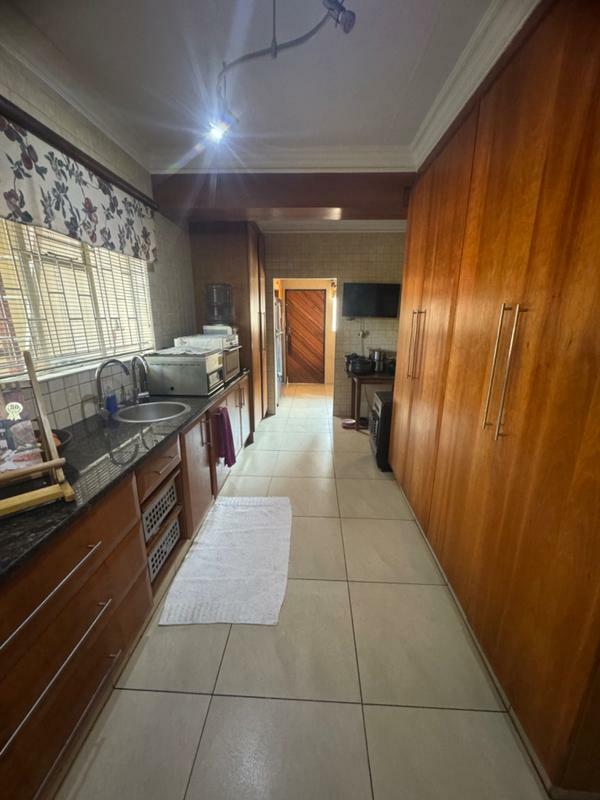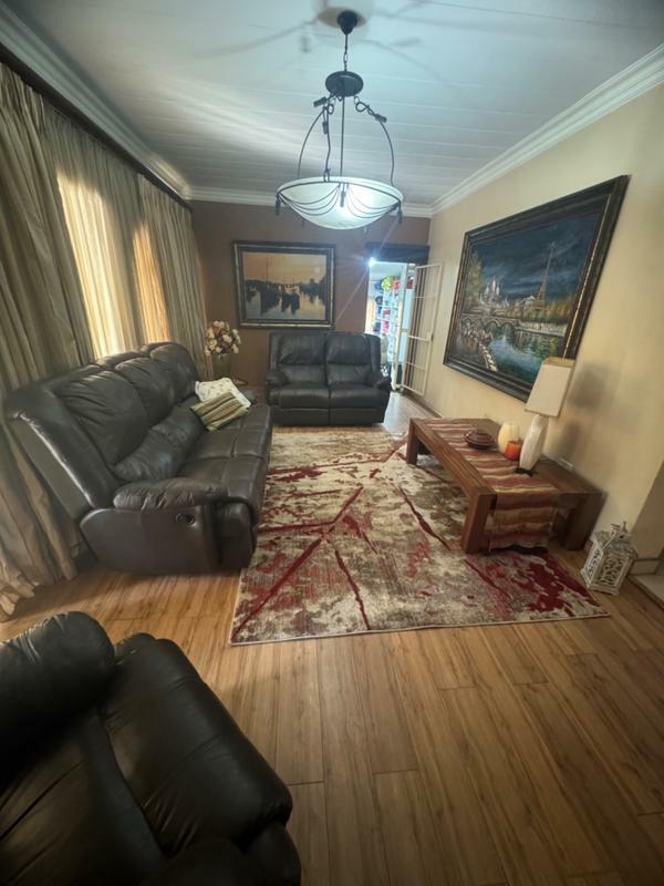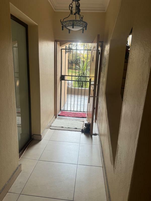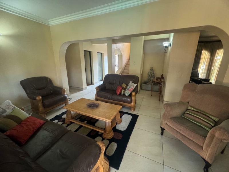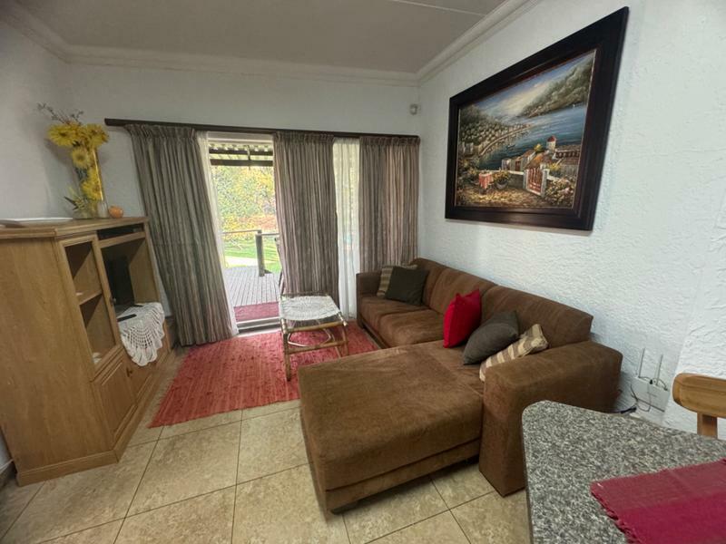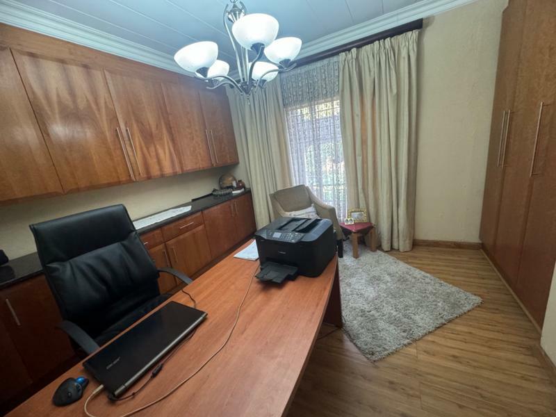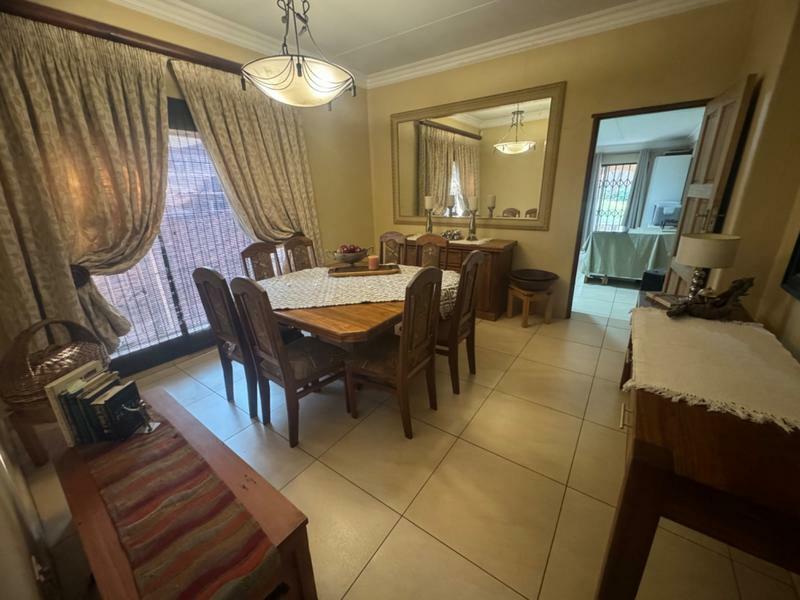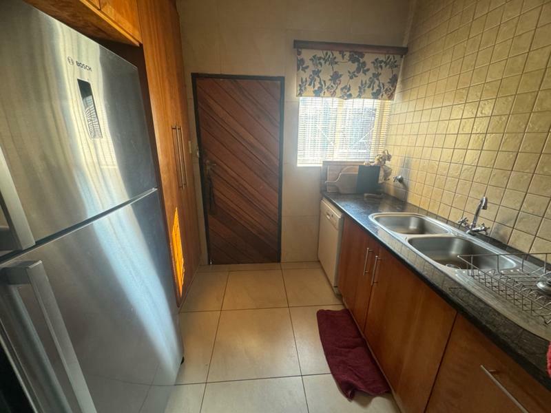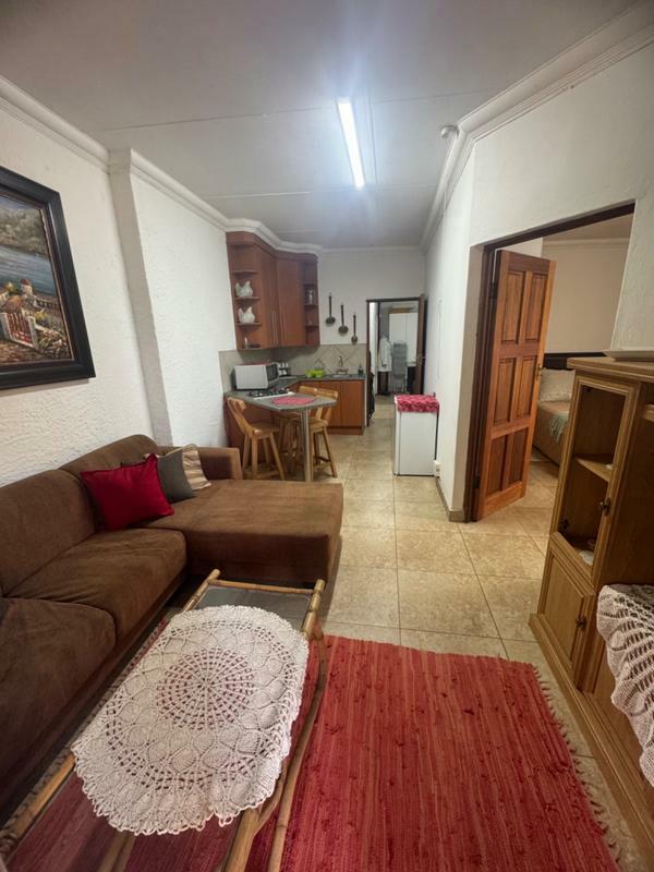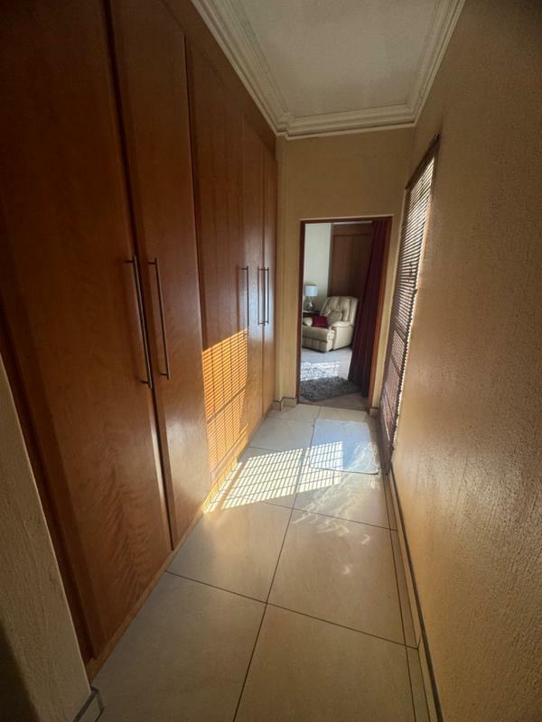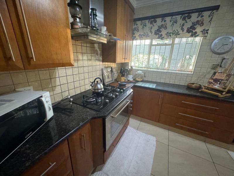 The main dwelling offers a guest toilet at the main entrance, next to the lounge and living room. Adjacent is a dining room and large kitchen with lots of cupboards, a gas stove with an electric oven, a scullery and a laundry.